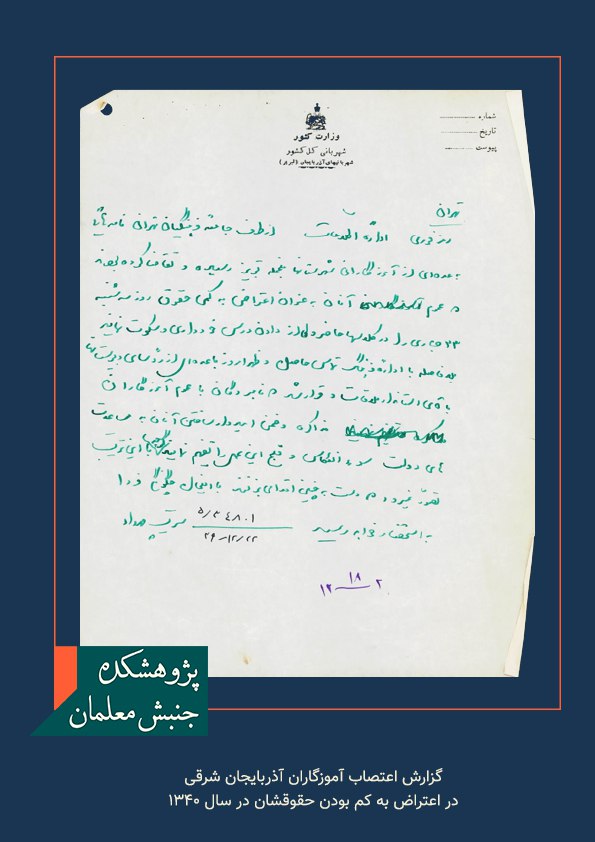 خانه/اسناد/گزارش اعتصاب آموزگاران آذربایجان شرقی در اعتراض به کم بودن حقوقشان – سال ۱۳۳۹ اسناد گزارش اعتصاب آموزگاران آذربایجان شرقی در اعتراض به کم بودن حقوقشان – سال ۱۳۳۹ گزارش اعتصاب آموزگاران آذربایجان شرقی در اعتراض به کم بودن حقوقشان - سال ۱۳۳۹ گزارش اعتصاب آموزگاران آذربایجان شرقی در اعتراض به کم بودن حقوقشان – سال ۱۳۳۹ برچسب هاآذربایجان شرقی اعتصاب اعتصاب معلمان اشتراک گذاری فیس بوک X لینکدین واتس آپ تلگرام اشتراک گذاری از طریق ایمیل چاپ