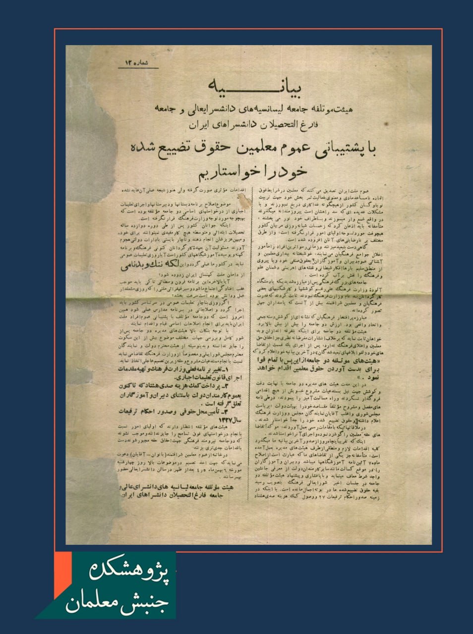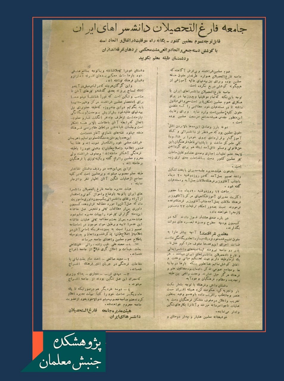 بیانیه فارغ التحصیلان دانشسراهای عالی ایران و هیئت مؤتلفه جامعه لیسانسههای ایران در مورد وضعیت نامناسب شغلی معلمان/ اسفند 1327