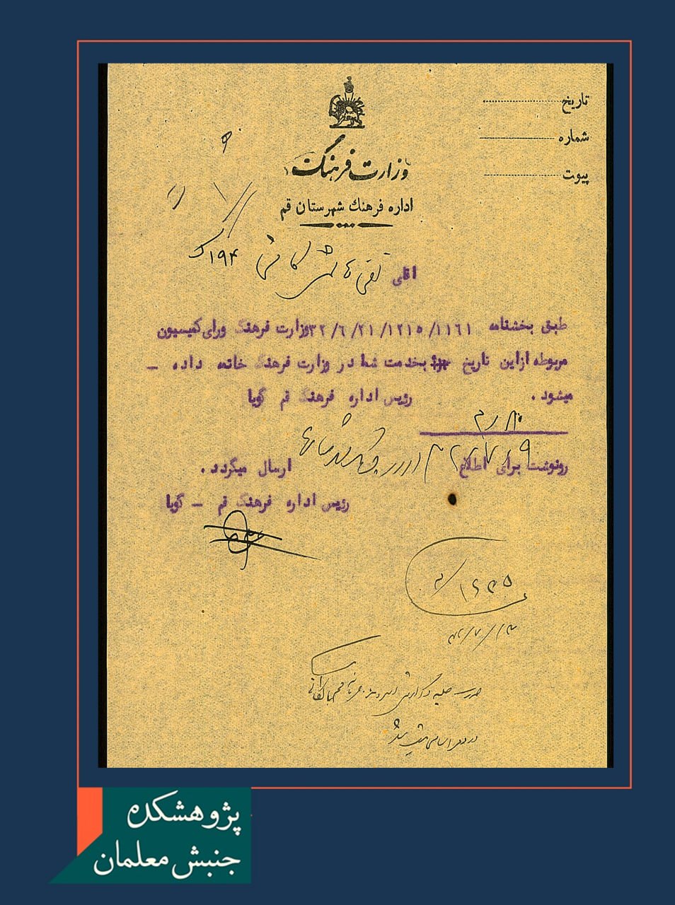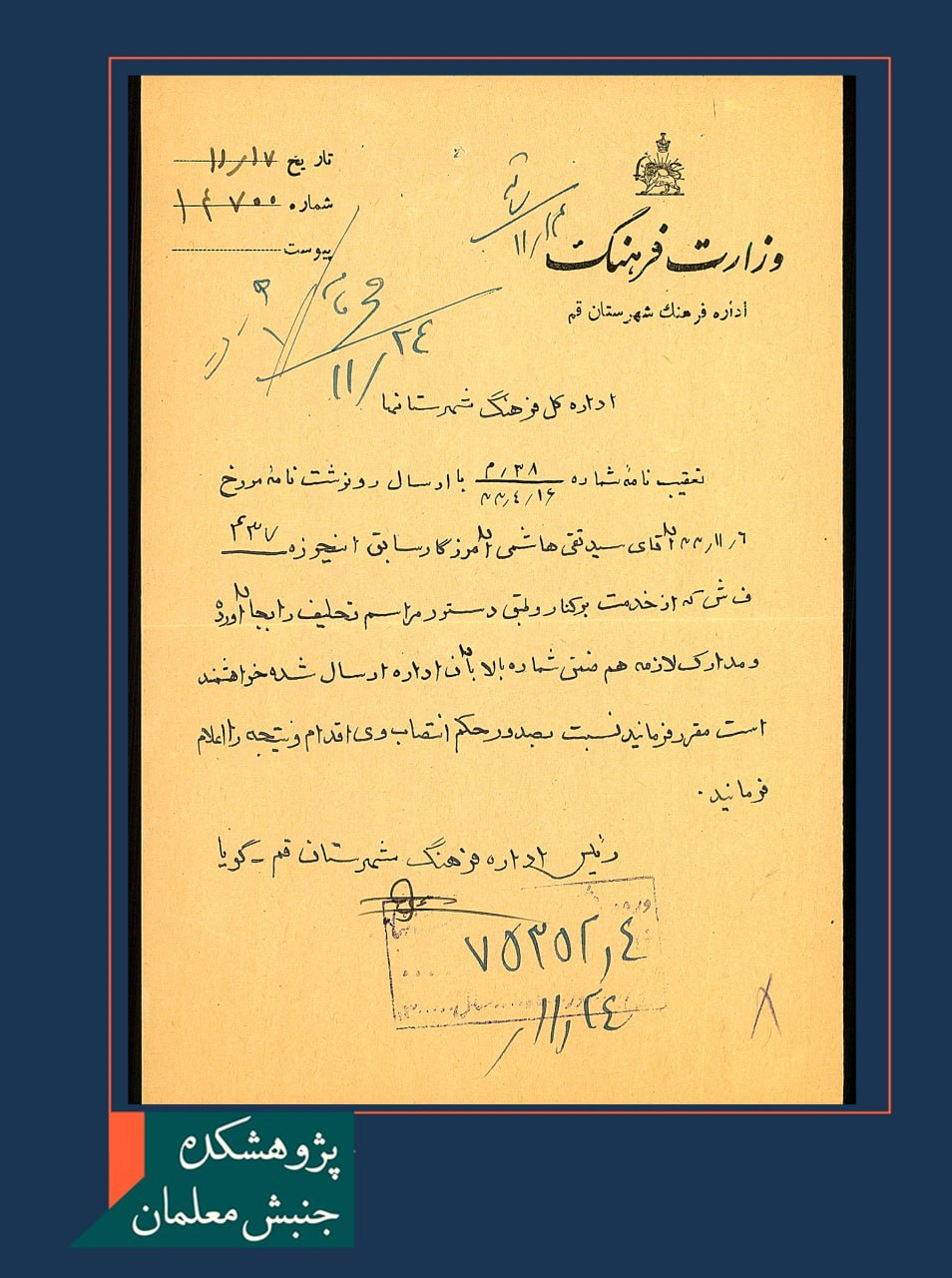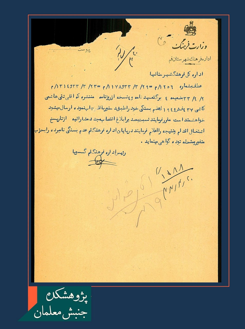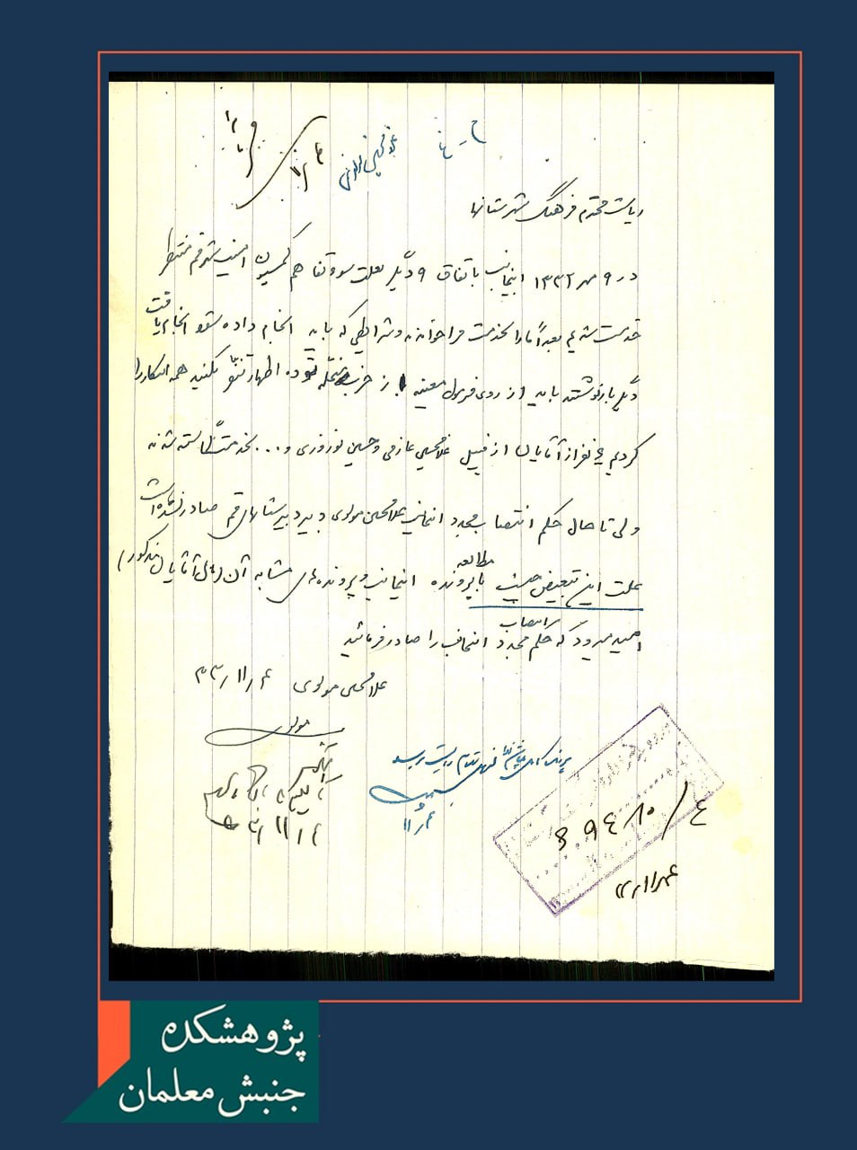 خانه/اسناد/اخراج سید تقی هاشمی از آموزشوپرورش قم به اتهام عضویت در حزب توده و منوط کردن بازگشت به کار او به نوشتن سوگند نامه و اعلام انزجار از حزب توده در روزنامه/ سال ۱۳۳۲ اسناد اخراج سید تقی هاشمی از آموزشوپرورش قم به اتهام عضویت در حزب توده و منوط کردن بازگشت به کار او به نوشتن سوگند نامه و اعلام انزجار از حزب توده در روزنامه/ سال ۱۳۳۲ اشتراک گذاری فیس بوک X لینکدین واتس آپ تلگرام اشتراک گذاری از طریق ایمیل چاپ