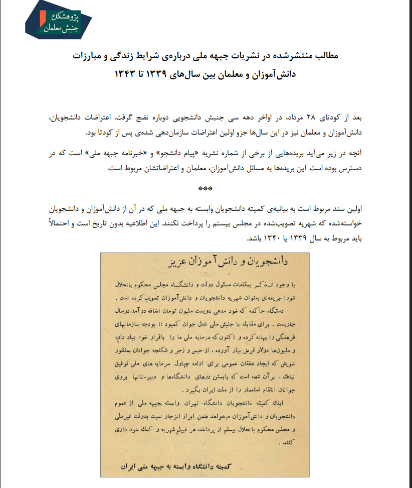 بازنشر اسناد و بیانیه‌های جبهه ملی و نشریات وابسته مانند «پیام دانشجو» درباره اعتراضات دانش‌آموزی